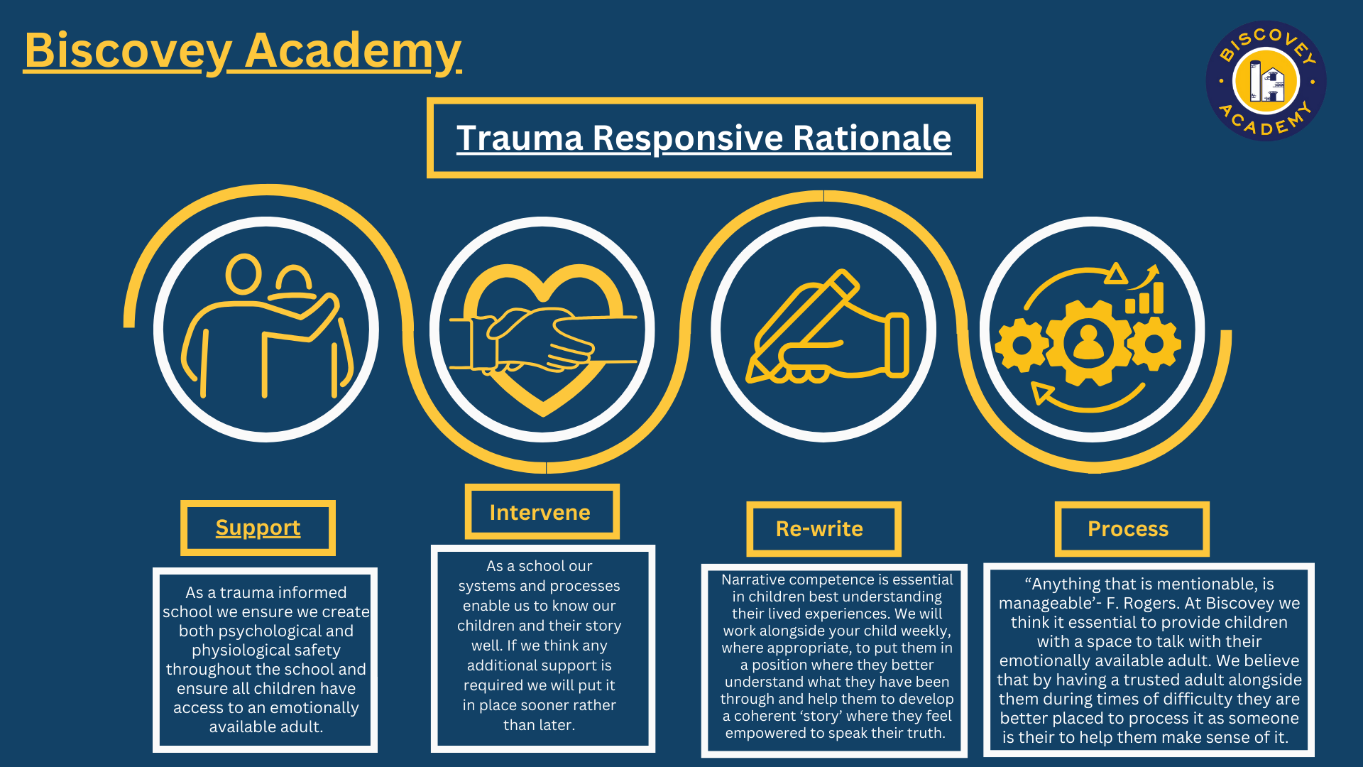 All adults in our school are aware of how to create an ethos and environment of both physical and psychological safety and have the skills to respond to those who have been impacted by traumatic stress. We fully understand and support the impact that connection with a trusted, emotionally available adult has on a child and seek to maximise this for those in our care who are identified as requiring additional support.